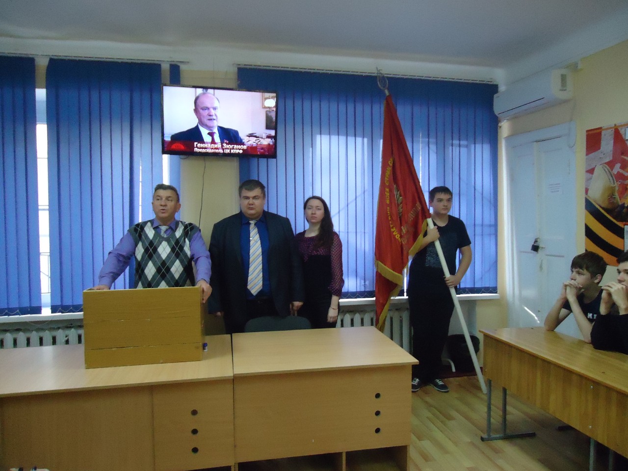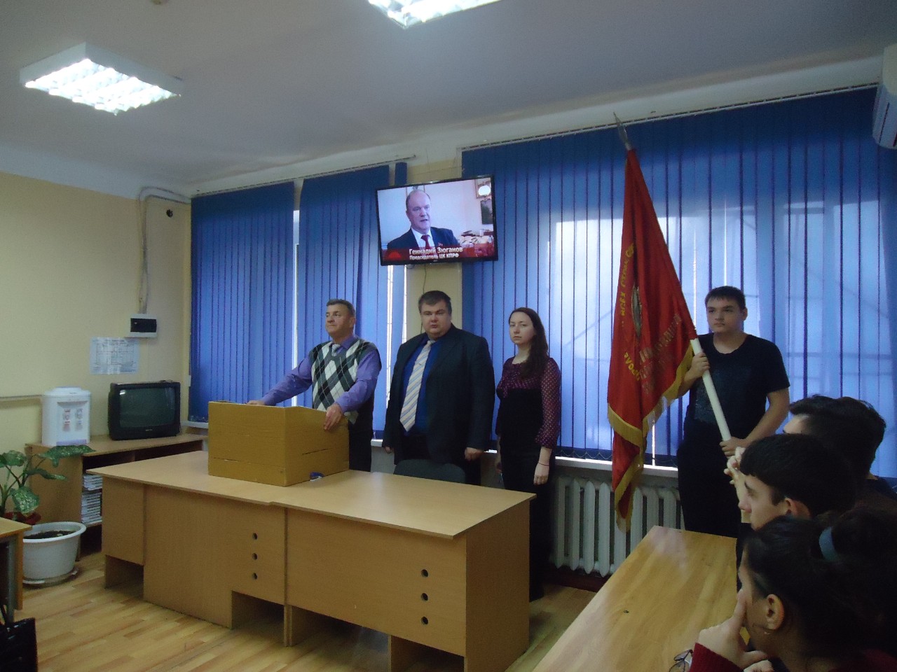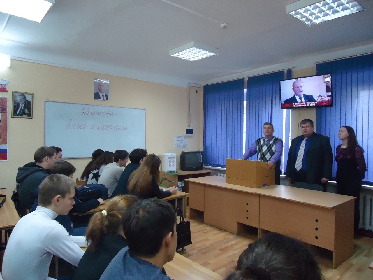 Открыл и вел урок председатель районного совета организации «Ветераны комсомола Кубани», первый секретарь Каневского районного Комитета КПРФ А.М. Лымарь, присутствовали члены райкома партии А.И. Дейневич и Н.А. Денисов. Интересны и памятны даты и дела Ленинского Комсомола, его биография, славный трудовой и боевой путь на благо Родины. Сотни примеров героизма на фронтах войны, в шахтах, на заводах и фабриках, на хлебных нивах, 6 орденов Советского союза говорят о беззаветной преданности и любви к Отчизне, прославляя ее за все эти годы. Ребята увидели видео-выступление лидера КПРФ Г.А. Зюганова на Всемирном форуме молодежи и студентов в Сочи.