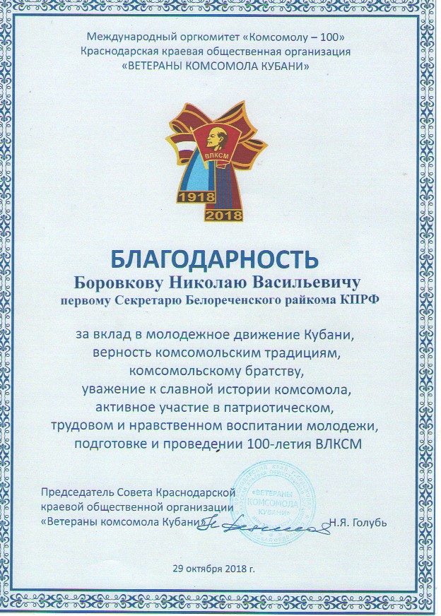 9 часов утра, Центральный парк города – возложение цветов к памятнику В.И. Ленину и вручение Почётных орденов ЦК КПРФ «100 лет Ленинскому комсомолу» активистам районного отделения КПРФ. Открыл мероприятие и вёл его Н.В. Боровков – председатель контрольно-ревизионной комиссии краевого отделения КПРФ, первый секретарь райкома партии, депутат районного Совета. Выступили секретари райкома – О.Н. Беспалова и В.Ю. Головяшкин, члены Бюро райкома – Н.Д. Майданюк, А.М. Тропин, А.И. Иванова, Н.В. Пшеничный и А.В. Лифарь, коммунист И.Д. Саввин, сторонник партии, поэт В.И. Савченко и бывший первый секретарь Белореченского горкома комсомола (в 80-е годы прошлого столетия) С.Ф. Муратов.