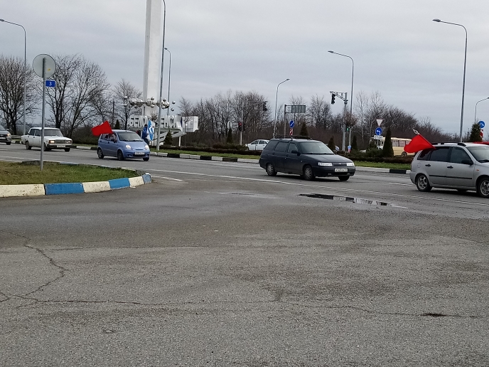 Сначала состоялся автопробег под красными знаменами КПРФ и Ленинского Комсомола.