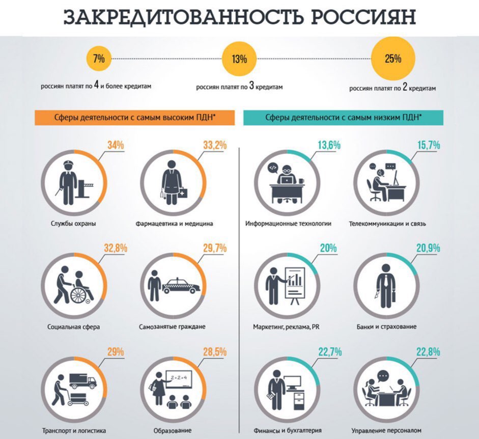 — 39,5 млн. россиян имеют кредиты. Самыми закредитованными среди работающих россиян являются охранники, социальные и медицинские работники, самозанятые граждане, работники транспортной сферы, а также сферы образования. У вышеперечисленной категории граждан самые высокие показатели долговой нагрузки (ПДН). Соотношение ежемесячных платежей по существующим кредитам варьируется от 28 до 34 % к уровню ежемесячного дохода гражданина.