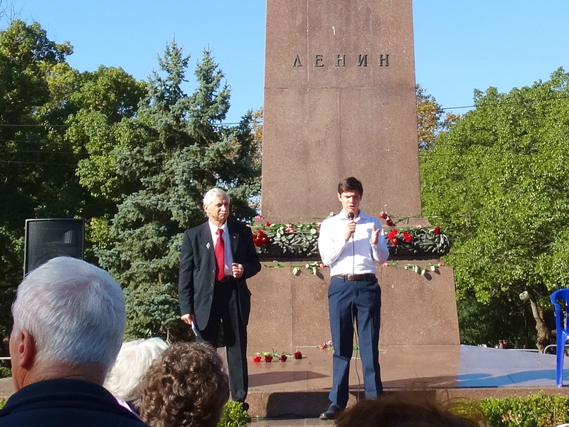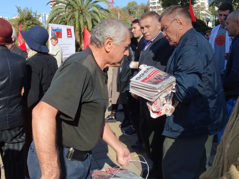 После праздничного концерта начался митинг. Первый секретарь горкома КПРФ Сергей Хамлов и секретарь горкома Анатолий Ерошенко вручили пятерым сочинцам, недавно вступившим в ряды КПРФ, партийные билеты.