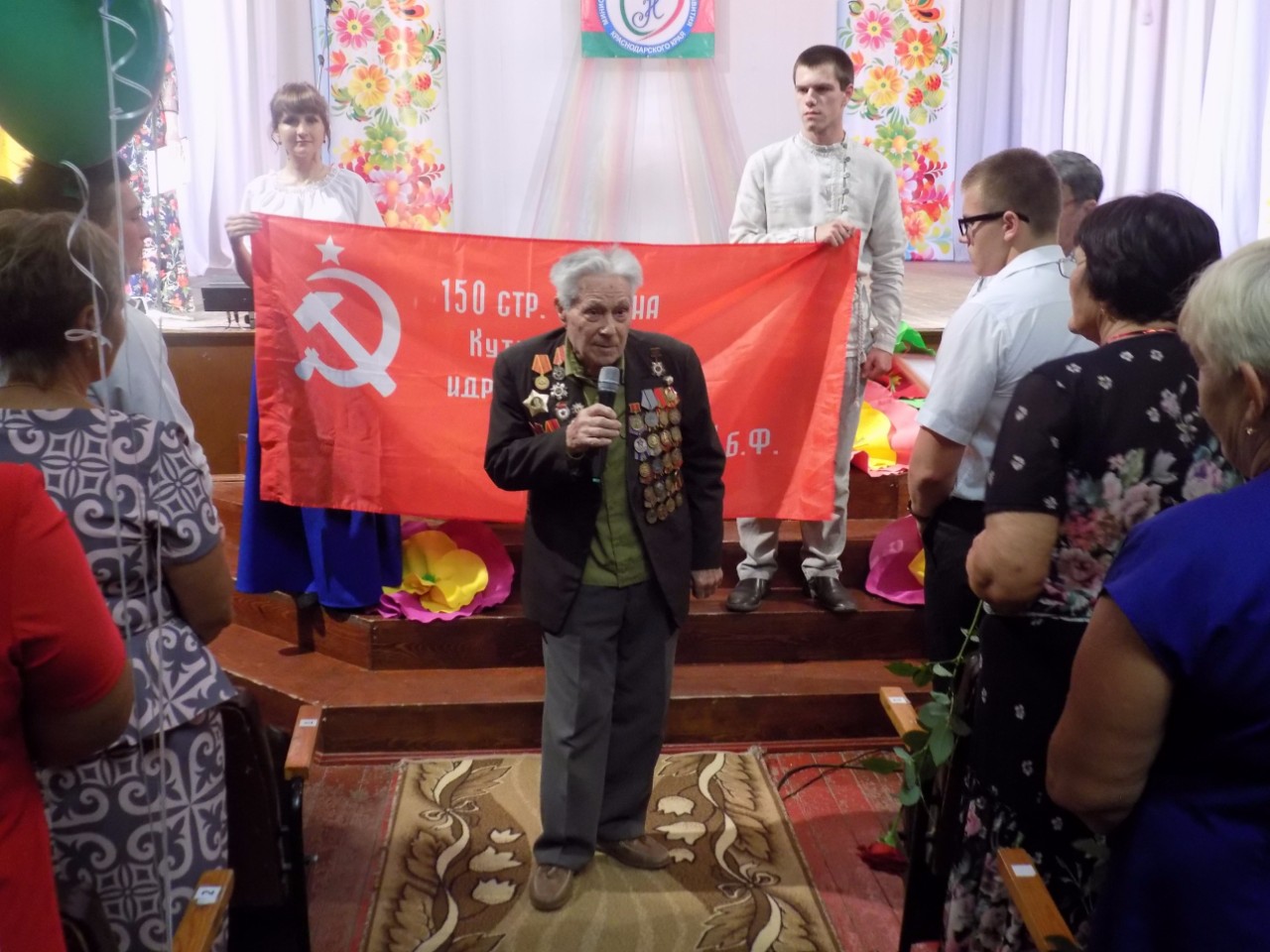 Во время этого мероприятия ветеран-коммунист Крошко Н.С. вручил представителям служб социального обслуживания точную копию Знамени Победы и сертификат к нему. В момент вручения весь зал встал! На мероприятии присутствовало несколько сотен работников служб социального обслуживания района и приглашенные гости.