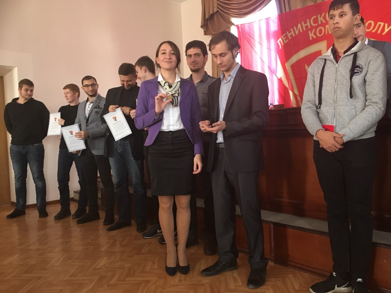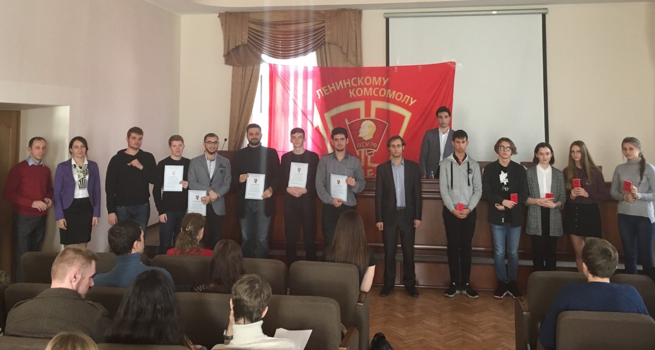 Затем А. Шакин, первый секретарь крайкома ЛКСМ, вручил вступившим в комсомол комсомольские билеты, а отличившимся активистам – почетные грамоты от организации «Ветеранов комсомола Кубани» и ордена, посвященные 100-летию Ленинского комсомола.