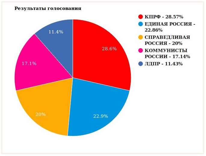 КПРФ осталась лидером и на этой неделе, набрав 28,6 процентов голосов опрошенных. На второе место поднялась партия «Единая Россия», заручившись 22,9 процентами голосов в свою поддержку. В середине списка закрепилась «Справедливая Россия», получив 20 процентов. На четвертом месте остановилась партия «Коммунисты России», получив 17,17 процентов голосов электората. Партия ЛДПР расположилась на последнем месте, набрав 11,43 процентов голосов.