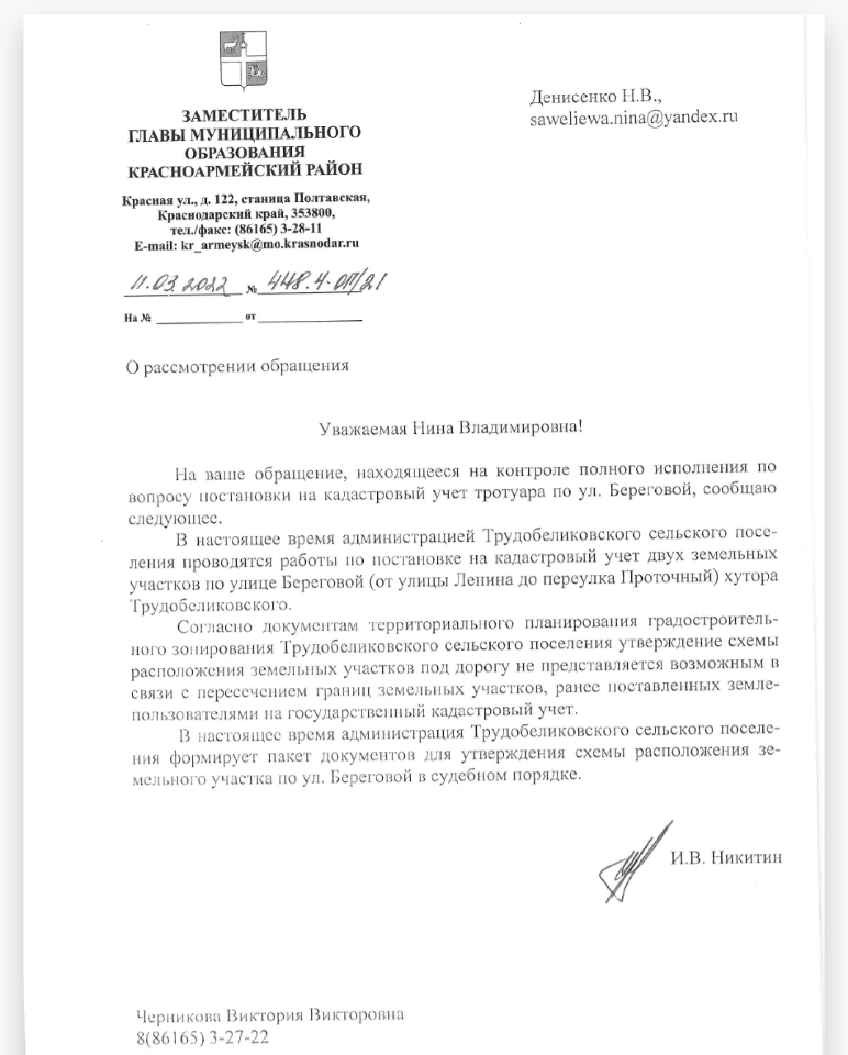 Когда жители узнали о том, что местная власть продала часть их улицы, то они подали жалобу в администрацию и в прокуратуру, а последняя вынесла представление администрации – устранить нарушение. При этом выяснилось, что ни одна дорога на улице Береговой не стоит на кадастре, и благодаря смещению администрацией «красной линии» в ПЗЗ в 2021 году, покупка фактически существующей дороги стала возможной.