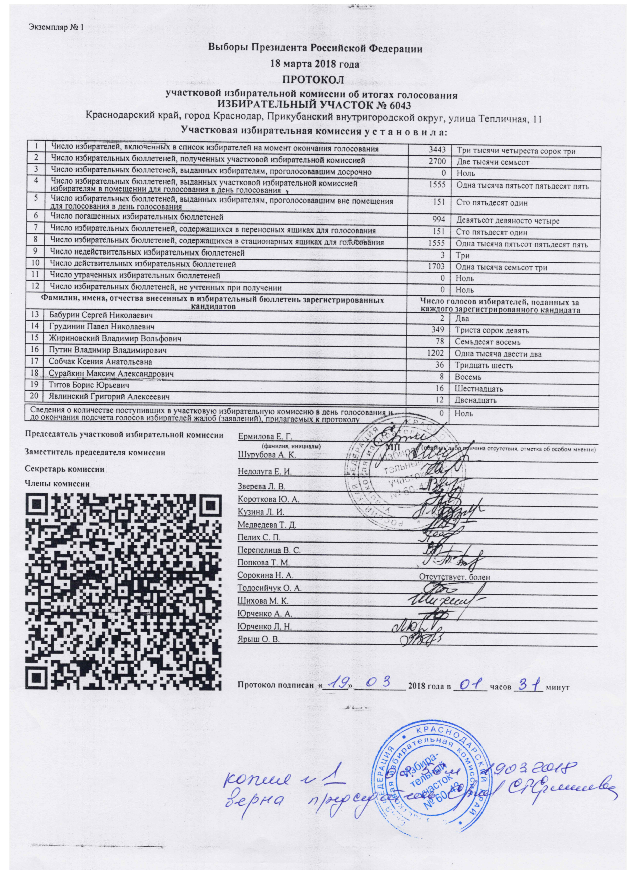 К тексту обращения прилагается копия протокола по выборам Президента РФ участковой избирательной комиссии № 60-43.