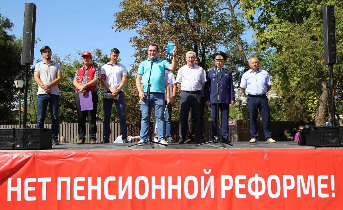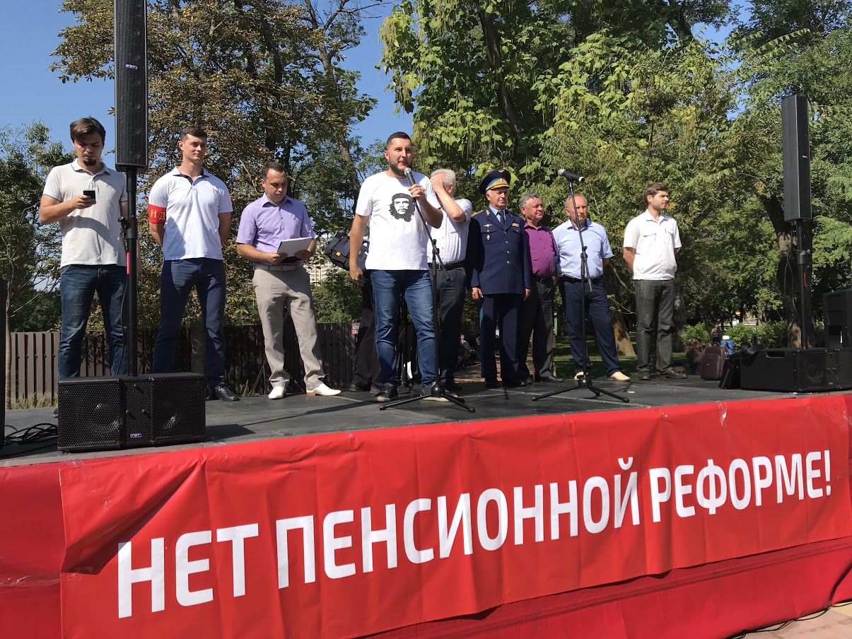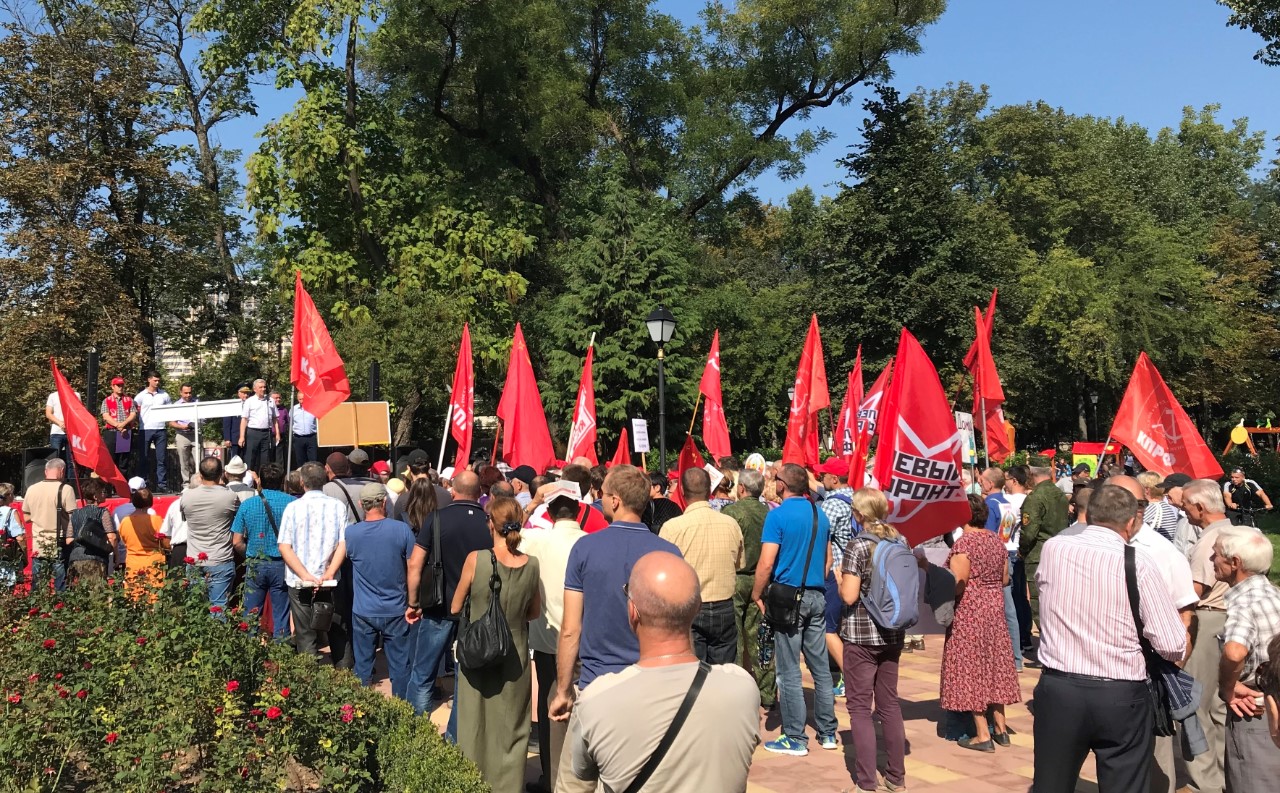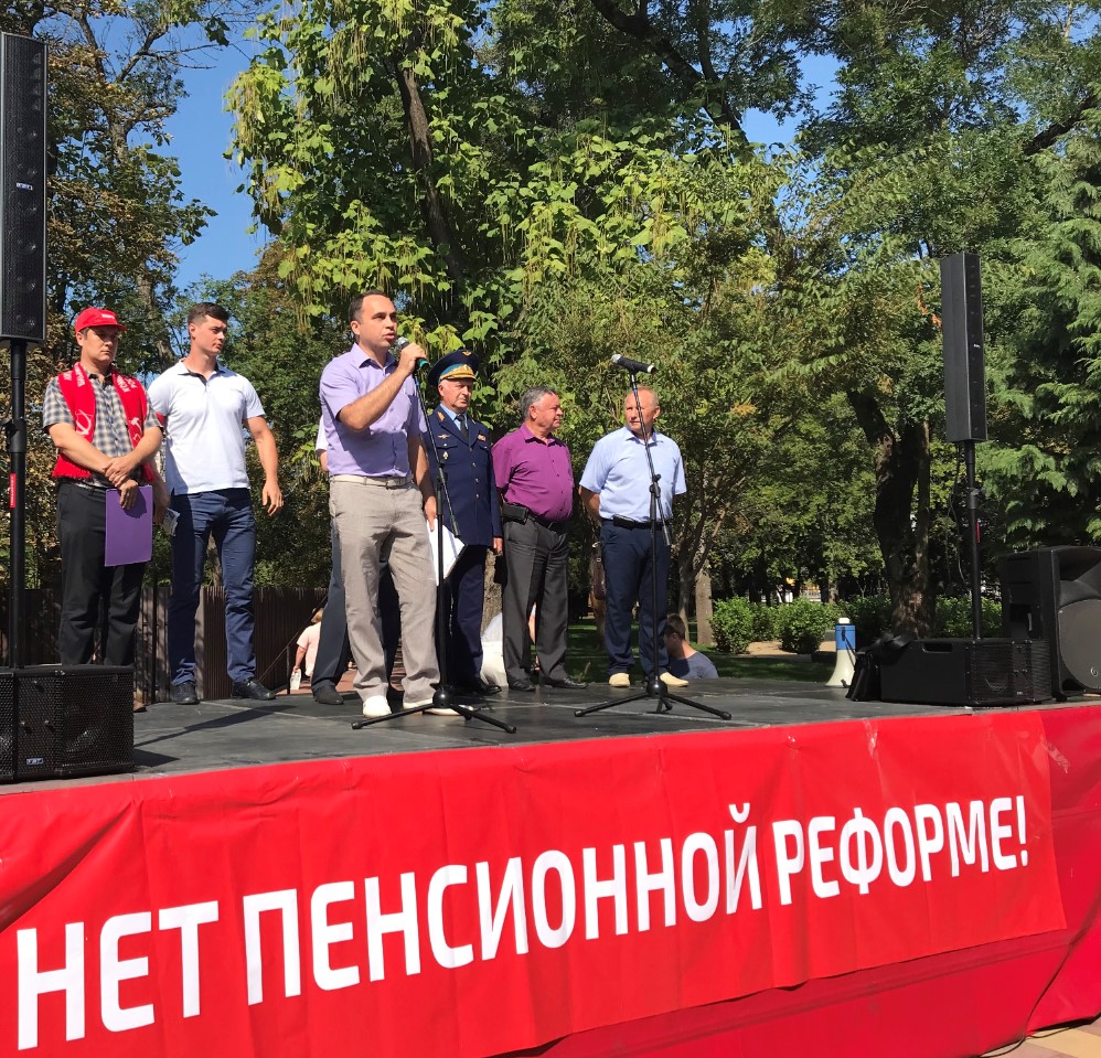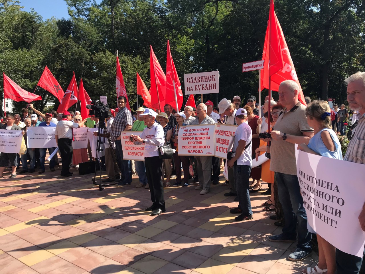 В Краснодаре прошел организованный крайкомом КПРФ митинг против так называемой пенсионной реформы и всего социально-экономического курса партии власти. Местом проведения, после сложных согласований с чиновниками из городской администрации, стал сквер «Вишняковский».