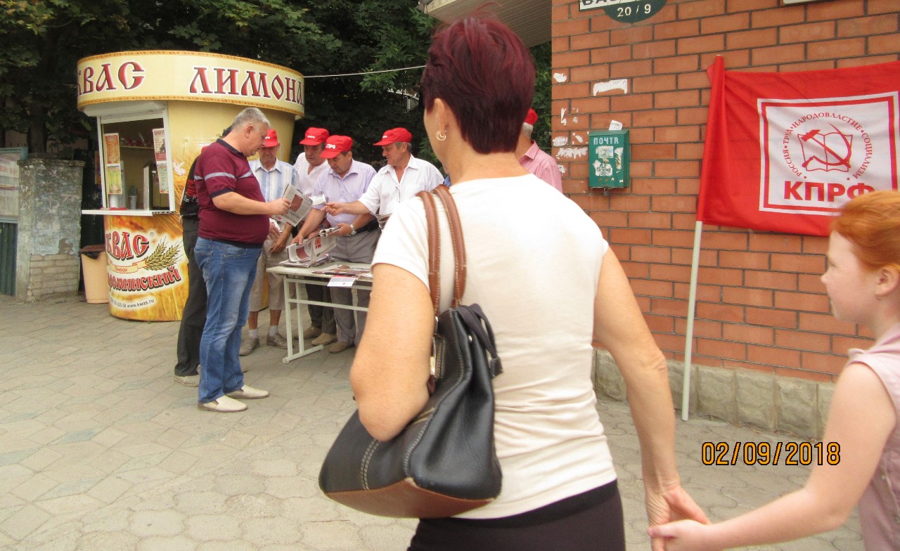 2 сентября активисты местных отделений КПРФ организовали пикеты – с распространением специальных выпусков «Правды» и «Советской России», в которых раскрывается антинародная сущность так называемой «пенсионной реформы», затеянной партией власти Путина-Медведева.