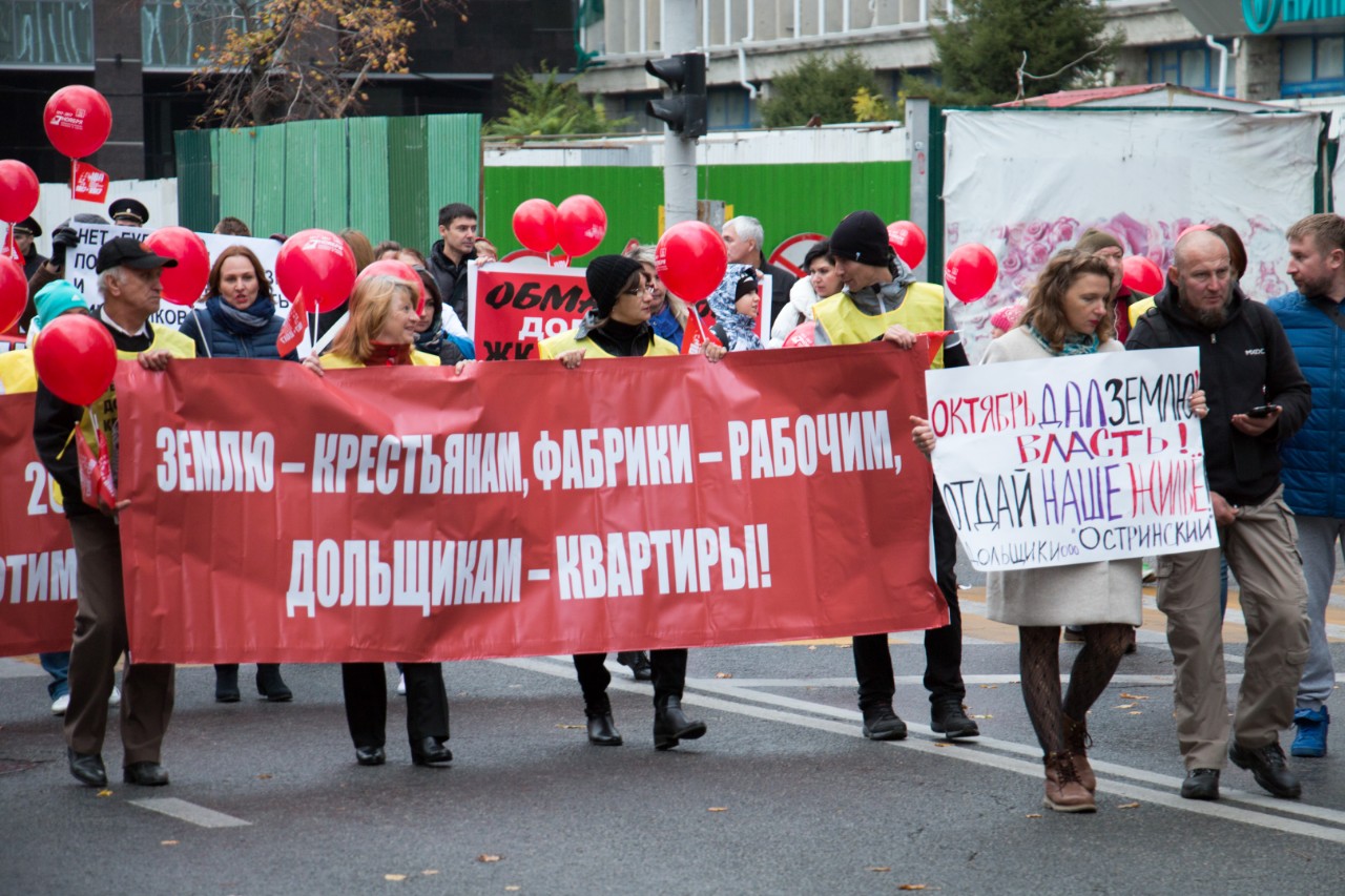 Колонну открывал автомобиль, оформленный транспарантами: «Вся власть — Советам», «Долой министров-капиталистов», «Против власти олигархов — За народную власть». Из динамиков, установленных на машине, звучали песни времен революции и Советской эпохи, лозунги и призывы ЦК КПРФ. Далее руководители Краснодарского крайкома КПРФ, коммунисты-депутаты Законодательного Собрания и Государственной Думы несли лозунг «Слава Великому Октябрю!». А вслед за ними шли делегации местных партийных отделений, ветераны и молодежь. В колонне также были представлены протестные группы населения — «обманутые дольшики» и другие.