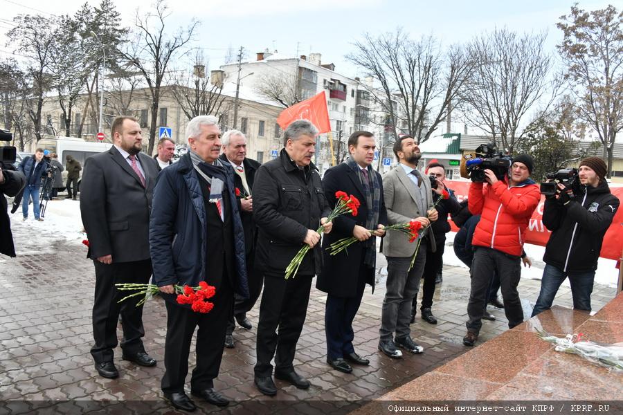 Прежде чем войти в здание, кандидат и другие представители предвыборного штаба возложили цветы к памятнику В.И. Ленину, расположенному на площади у Дворца культуры.
