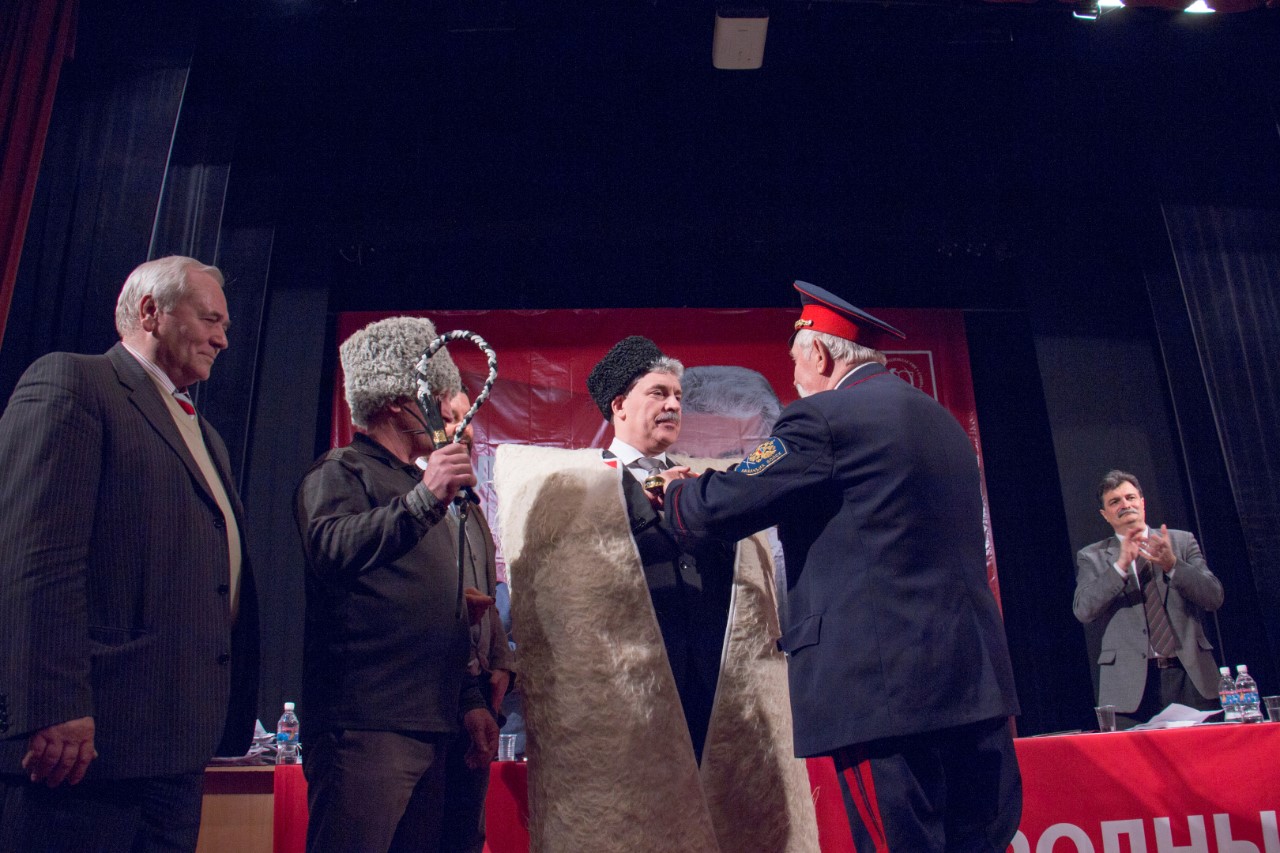 От имени жителей Кубани П.Н. Грудинину прямо на сцене были вручены казачья шашка, бурка и нагайка.