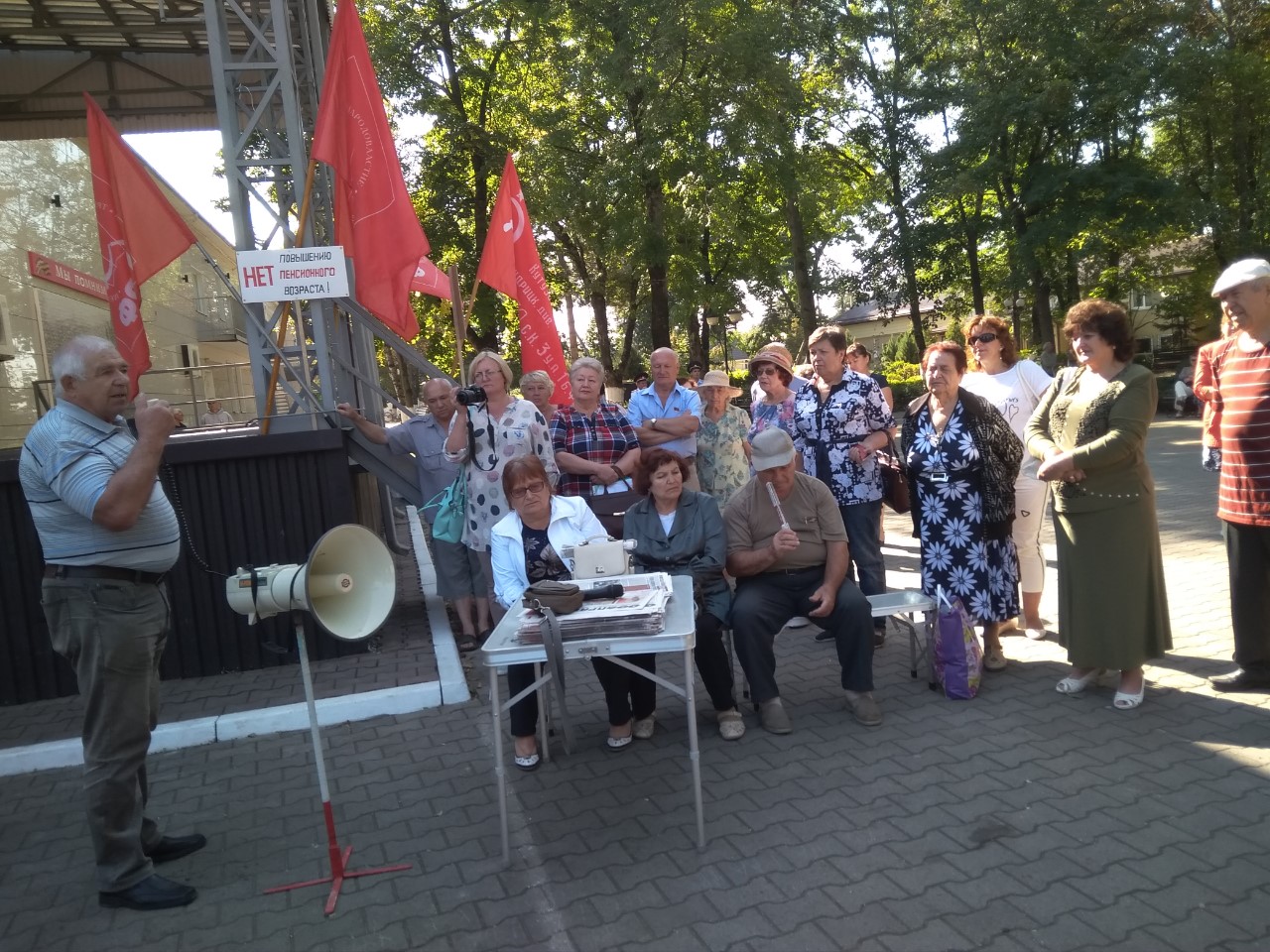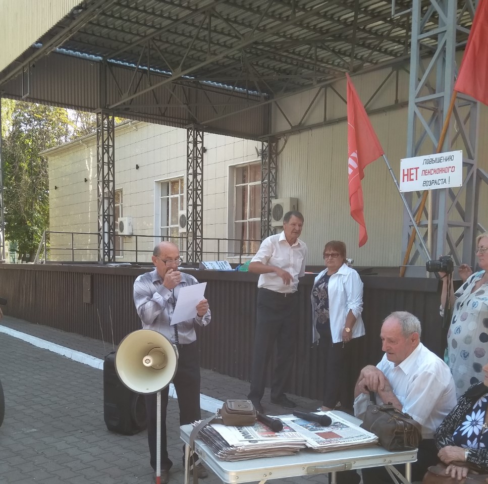 Вступительное слово произнес секретарь районного Комитета КПРФ В.Б. Погожев. Он обстоятельно раскрыл необоснованность и несвоевременность повышения пенсионного возраста, а также проинформировал участников митинга о беззаконии властей на выборах 9 сентября.