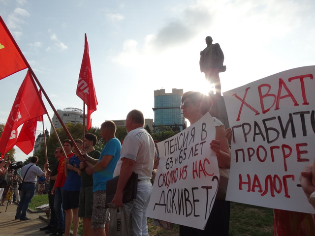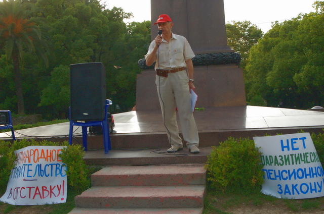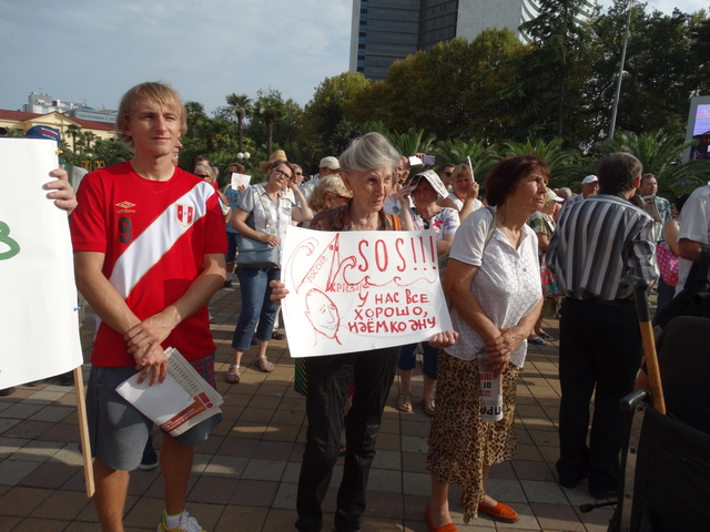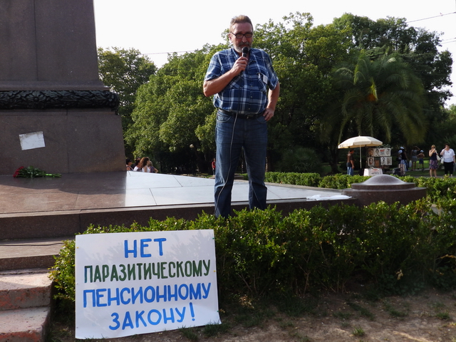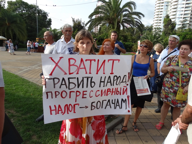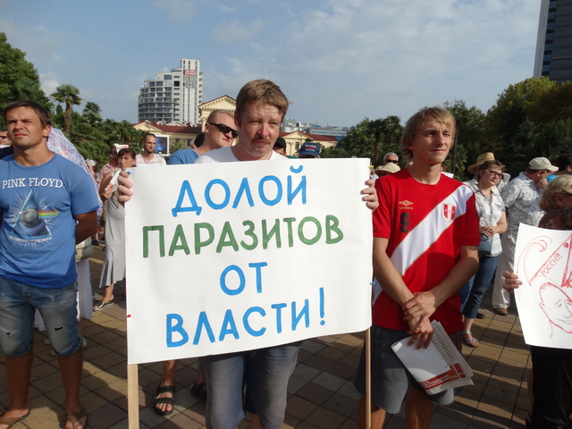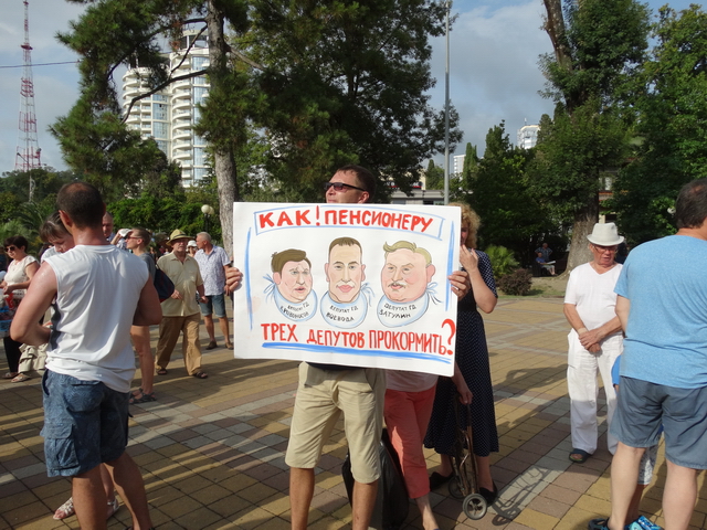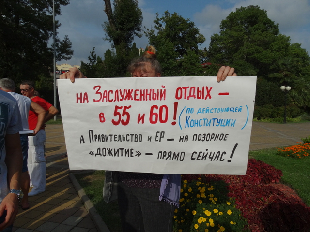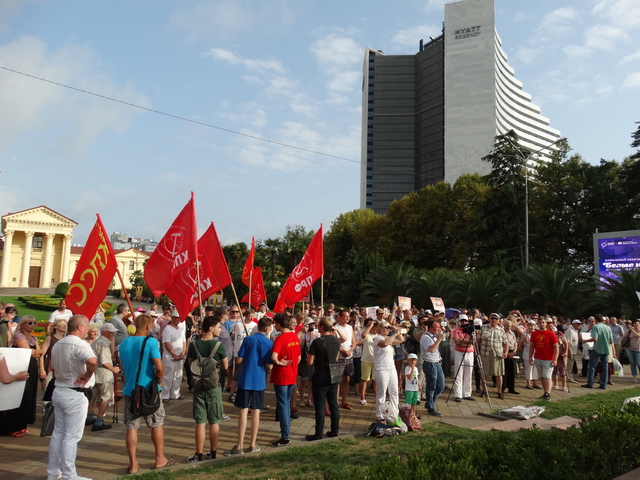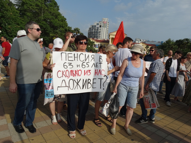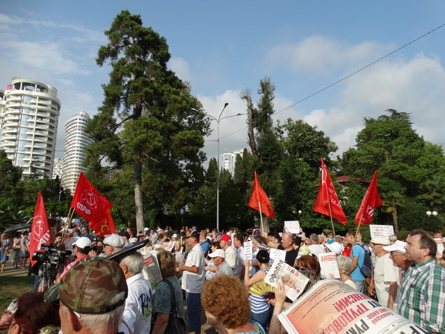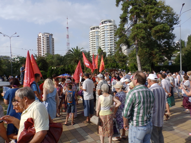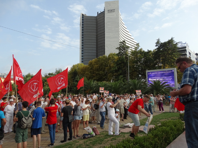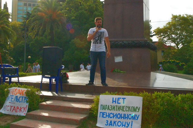Митинг против намерений Правительства РФ и партии «Единая Россия» повысить пенсионный возраст прошёл в городе-курорте Сочи 28 июля вечером. Послеобеденное время было выбрано организаторами для того, чтобы не подвергать потенциальных участников пытке под палящим солнцем на открытой площади.